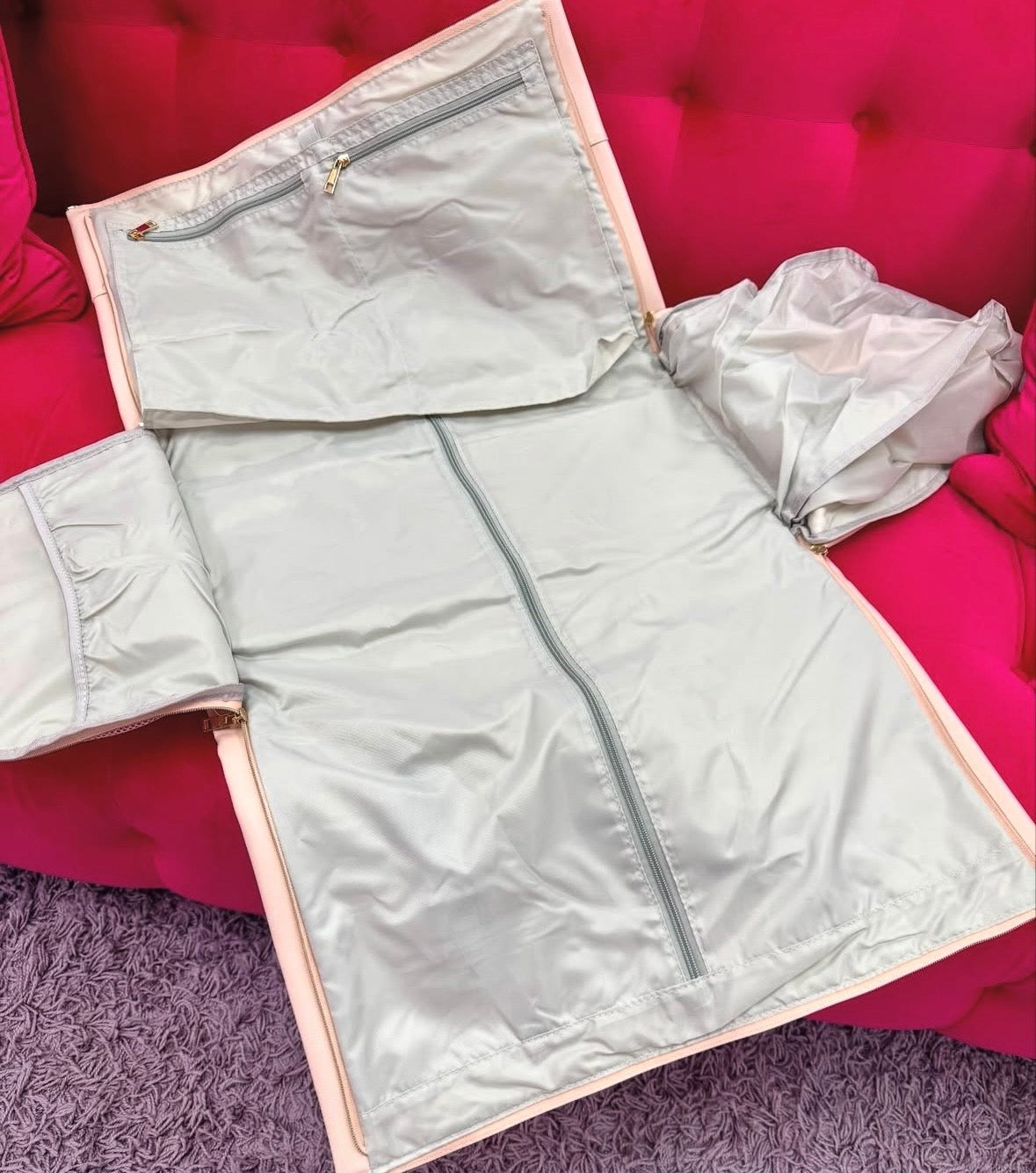 The Garment Duffel Bag by Kissed By Glitter is a versatile 2 in 1 travel bag designed to keep outfits wrinkle free while carrying all your essentials. It lays flat as a full length garment bag, then zips into a structured duffel with space for shoes, accessories, and toiletries. Perfect for competitions, performances, weekends away, or carry on travel, it is durable, lightweight, and available in Pink or Black for effortless travel on the go.