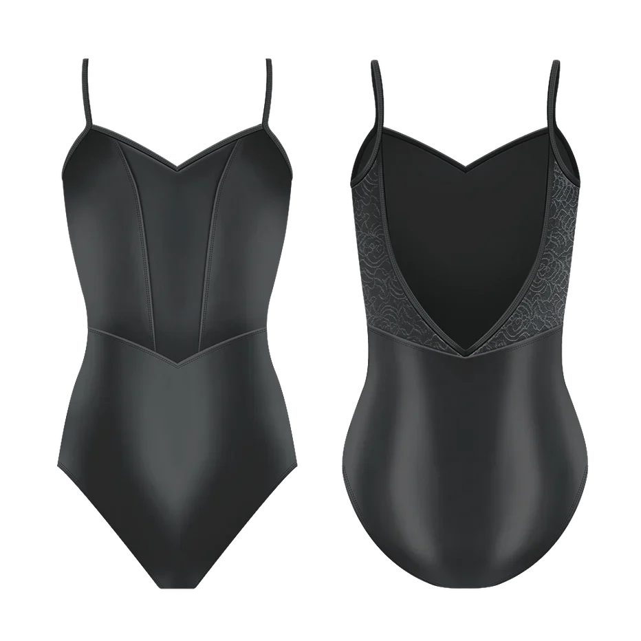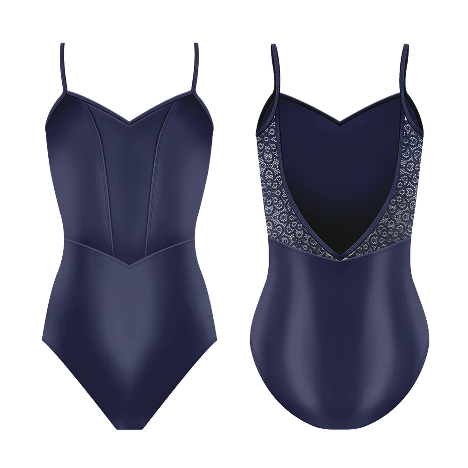 The Chanelle Leotard L0003L/L0113L from Danse De Paris features a sleek, slim fit with signature bodice panelling and French princess seams for a beautifully sculpted look. An elegant 'V' front and plunging back with contrasting lace highlight the waist, while a high-cut leg enhances your silhouette.